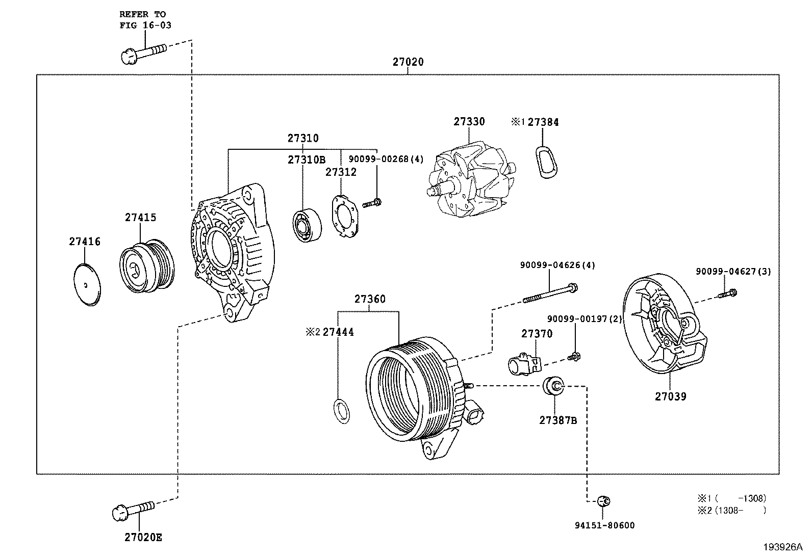 PREMIO ALLION |  ALTERNATOR ** Refer Fig 27020 - ALTERNATOR ASSY 27020E - BOLT(FOR ALTERNATOR) 27039 - COVER, ALTERNATOR REAR END 27310 - FRAME ASSY, DRIVE END, ALTERNATOR 27310B - BEARING(FOR ALTERNATOR DRIVE END FRAME) 27312 - PLATE, RETAINER 27330 - ROTOR ASSY, ALTERNATOR 27360 - COIL ASSY, ALTERNATOR 27370 - HOLDER ASSY, ALTERNATOR BRUSH 27384 - WASHER 27387B - INSULATOR, ALTERNATOR TERMINAL 27415 - PULLEY, ALTERNATOR W/CLUTCH 27416 - CAP, ALTERNATOR PULLEY 27444 - PACKING, ALTERNATOR BEARING COVER  ** Std Part  ** Std Part  ** Std Part  ** Std Part  ** Std Part