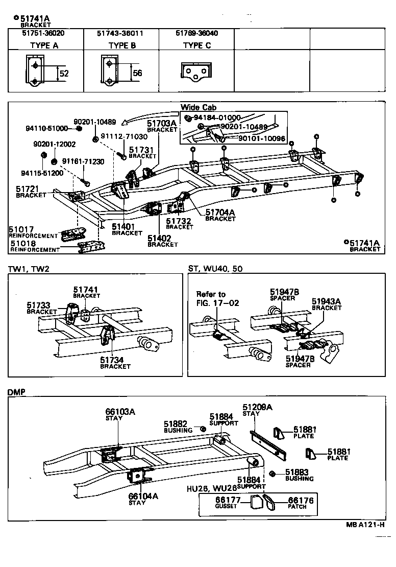 DYNA |  FRAME ** Refer Fig 51017 - REINFORCEMENT SUB-ASSY, SIDE RAIL, NO.1 RH 51018 - REINFORCEMENT SUB-ASSY, SIDE RAIL, NO.1 LH 51209A - STAY, LICENSE PLATE BRACKET 51401 - BRACKET SUB-ASSY, ENGINE FRONT MOUNTING, RH 51402 - BRACKET SUB-ASSY, ENGINE FRONT MOUNTING, LH 51703A - BRACKET SUB-ASSY, CAB REAR MOUNTING, RH 51704A - BRACKET SUB-ASSY, CAB REAR MOUNTING, LH 51721 - BRACKET, CAB FRONT MOUNTING, RH 51731 - BRACKET, CAB REAR MOUNTING, RH 51732 - BRACKET, CAB REAR MOUNTING, LH 51733 - BRACKET, CAB REAR MOUNTING, NO.2 RH 51734 - BRACKET, CAB REAR MOUNTING, NO.2 LH 51741 - BRACKET, REAR BODY MOUNTING, NO.1 51741A - BRACKET, BODY MOUNTING 51741A - BRACKET, BODY MOUNTING  ** Std Part  ** Std Part  ** Std Part 51881 - PLATE, FRAME END 51881 - PLATE, FRAME END 51882 - BUSHING, VESSEL HINGE, RH 51883 - BUSHING, VESSEL HINGE, LH 51884 - SUPPORT, VESSEL HINGE SHAFT 51884 - SUPPORT, VESSEL HINGE SHAFT 51943A - BRACKET, SPARE WHEEL CARRIER 51947B - SPACER, SPARE WHEEL 51947B - SPACER, SPARE WHEEL 66103A - STAY SUB-ASSY, TRUNNION, RH 66104A - STAY SUB-ASSY, RUNNION, LH 66176 - PATCH, CHASSIS RAIL 66177 - GUSSET, CHASSIS RAIL  ** Std Part  ** Std Part  ** Std Part  ** Std Part  ** Std Part  ** Std Part  ** Std Part  ** Std Part  ** Std Part
